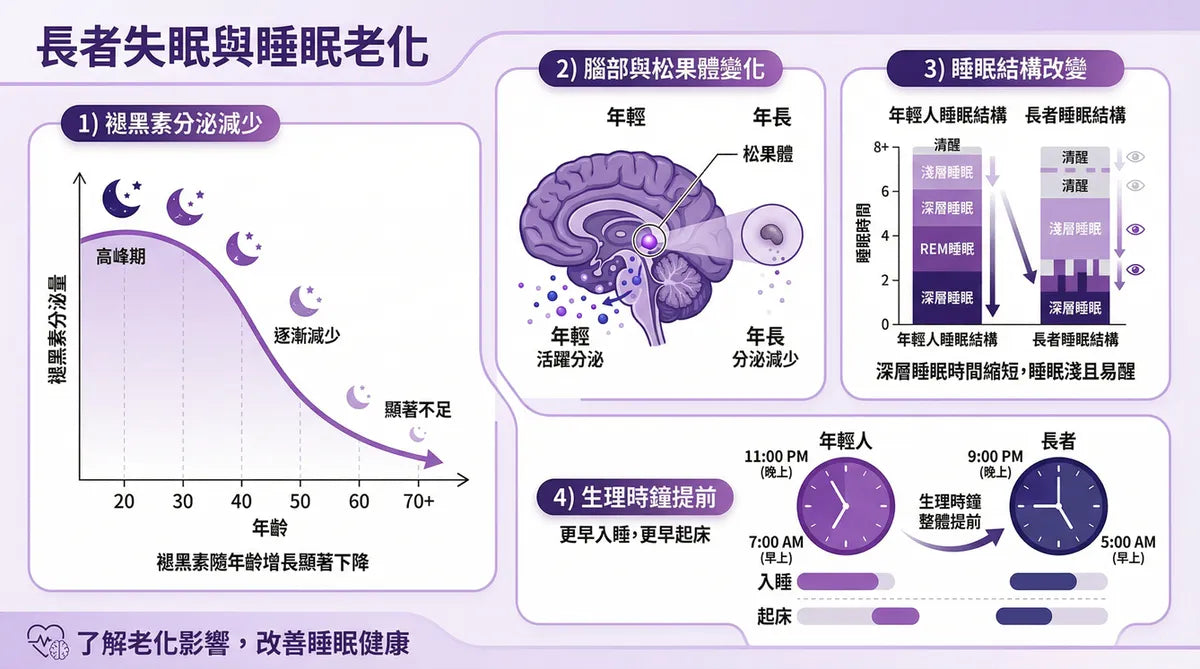 60歲後褪黑激素分泌只剩年輕時的一半,深層睡眠時間縮短,生理時鐘提前,所以長者容易早醒、淺睡。
