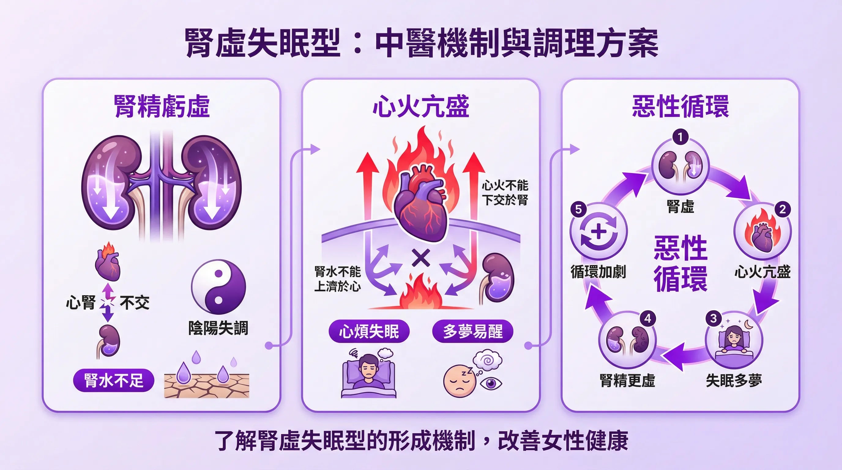 腎為先天之本,藏精主水。心屬火,腎屬水,正常情況下心火下降溫腎,腎水上濟養心,水火既濟。腎精虧虛,腎水不能上濟心火,心火獨亢,則心神不寧、失眠多夢。女性更年期後腎陰漸虧,更易出現心腎不交之失眠。